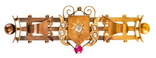 BAR BROOCH, in gold (15ct; 6.37g; 56x18mm), attributed to maker, Aronson & Co, features a highly decorated triple bar with a shield in the middle and in the centre of this is a small white diamond in a star setting and the shield with a leaf on each side each set with three seed pearls and at the base of the shield is a small claw set red gemstone, pin-back. Toned very fine.