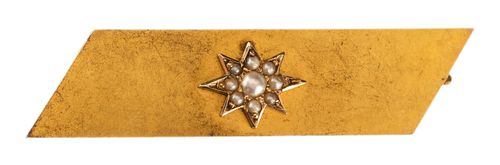 PARALLELOGRAM SHAPED BROOCH, in gold (9ct; 4.00g; 46.5x11mm), by Wendt, features a plain bar with a centre star decorated with natural seed pearls, pin-back. Toned good very fine.