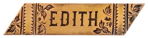 PARALLELOGRAM SHAPED BROOCH, in gold (9ct; 3.43g; 44x10mm), by J.M.W (J.M. Wendt), engraved decorated and with the name, "EDITH" in the centre, pin-back, with unofficial box. Toned very fine.