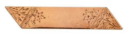 PARALLELOGRAM SHAPED BROOCH, in gold (9ct; 3.23g; 43x10mm), by J.M.W (J.M. Wendt), pin-back, engraved decorated ...