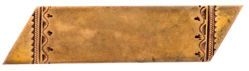 PARALLELOGRAM SHAPED BROOCH, in gold (9ct; 3.03g; 48x9mm), by Wendt, engrave decorated ends, pin-back. Hairlines, ...