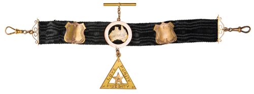WRIST BAND, in black ribbon with fob chain clips at each end and attached to the ribbon are two shields in 9ct gold, one circular attachment in 9ct gold and with a fob fitting and inside the circle is a map of Australia and attached below this circular attachment is a voided 9ct gold Temperance Society symbol being a triangle with a star in the centre and inscribed with the words, "Love Purity Fidelity", the reverse of this is inscribed, "From S.K to E.C. 21.3.23", various pieces attributed to Aronson & Co, Larard Bros and E.G.Stott (tot wt of all items 16.60g). Very fine. (5 items)