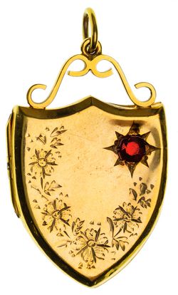 HEART LOCKET, in gold (9ct; 4.91g; 22x26mm), attributed to maker, H.Simonsen, features a heart shaped locket with decoration on the front and a red gemstone in the top right corner, reverse is plain, with scroll and ring top suspender. Some bumps, otherwise very fine.