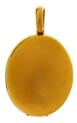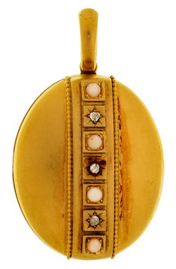 DIAMOND AND CORAL PENDANT, c1870, in gold (18ct; 24.09g; 35x42mm), attributed to Kilpatrick & Co, features a gold locket with a centre strip of three old mine cut diamonds and four coral beads, with large suspender bracket, with Kilpatrick & Co fitted case. Hairlines, otherwise good very fine.