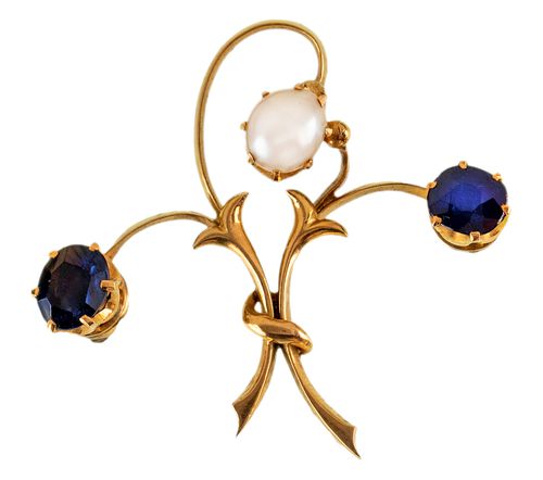 ART NOUVEAU BROOCH, c1905, in gold (15ct; 2.88g; 29x26.5mm), by J.M.W. (J.M.Wendt), features an artistic display featuring two claw set sapphires and a claw set natural pearl, pin-back, with J.M.Wendt fitted case. Extremely fine.