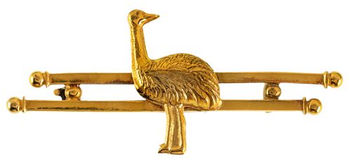 EMU BROOCH, c1910, in gold (15ct; 3.48g; 49x21mm), by A.L.B (August L. Brunkhorst), features a double bar with an emu in the centre and looking over its back, pin-back, with different jeweller's case. Extremely fine.