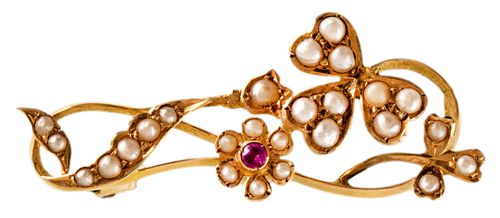 FLORAL BROOCH, in gold (15ct; 4.17g; 42x19mm), attributed to Benjamin & Sons, features a voided floral display with a red gemstone in the centre of one flower and the rest of the floral display decorated with 26 seed pearls, pin-back. Extremely fine.