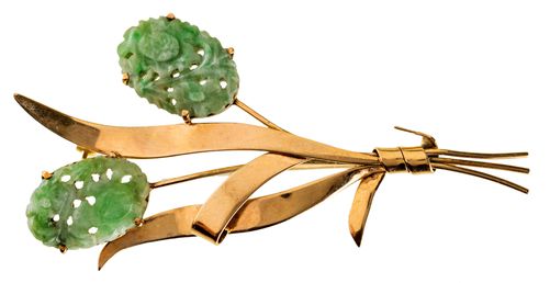 FLORAL BROOCH, in gold (9ct; 10.11g; 76x39mm), by Wendts, features a flower spray with two claw set oval jade flowers with several holes in each, lockable pin-back. Good very fine.
