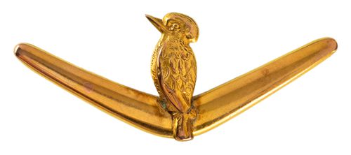 KOOKABURRA BROOCH, in gold (9ct; 2.90g; 46.5x19mm), maker unknown, features a kookaburra sitting in the bend of a boomerang and facing left, pin-back. Good very fine.