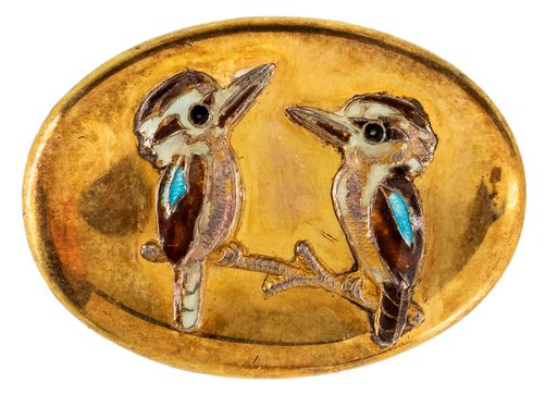 KOOKABURRA BROOCH, in 9ct silver lined (4.80g; 36x25mm), maker unknown, features two enamelled kookaburras sitting ...