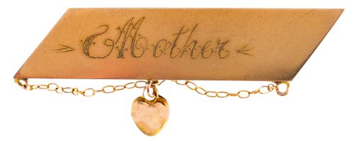 MOTHER BROOCH, in gold (9ct; 3.67g;47x19mm), by J.M.W. (J.M.Wendt), features a parallelogram bar inscribed, "Mother", and below is a thin chain running from both ends of the bar and joined at the centre of the bar at a loop from which is suspended a heart shape, pin-back. Very fine.