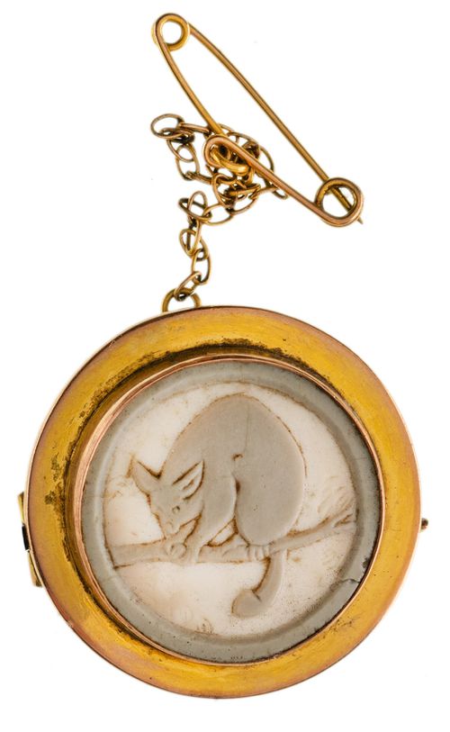 POSSUM BROOCH, in gold (9ct; 4.98g; 26mm), attributed to maker, H.Simonsen, features possum on a branch carved from an emu egg and inset in a raised gold frame, pin-back with safety chain. Toned very fine.