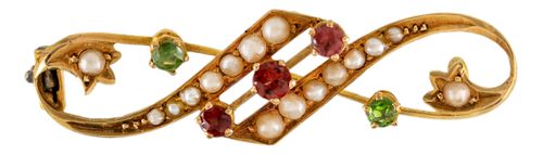 SCROLL BROOCH, in gold (15ct; 3.84g; 43x12mm), attributed to maker, Willis & Sons, features double scroll decorated with demantoid garnets (2 green), red garnets (3) and natural seed pearls (16), pin-back. Good very fine.