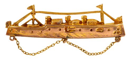 SHIP BROOCH, c1900, in gold (9ct; 2.29g; 47x13mm), attributed to maker, Aronson & Co, features a ship steaming left, pin-back and with a chain attached to three loops at the ship's base, with unofficial box. Very fine.