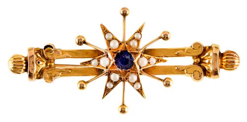 STARBURST BROOCH, in gold (9ct; 3.78g; 54x25mm), attributed to maker, Aronson & Co, features a decorative double bar with a starburst in the centre featuring a blue gemstone in the centre of the star with twelve natural seed pearls in the star arms, pin-back. Very fine.
