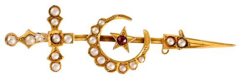 SWORD BROOCH, in gold (9ct;3.69g; 67x20mm), attributed to maker, Benjamin & Sons, features a sword with a crescent in the centre with a centre star with small red gemstone, the crescent is decorated with nine imitation seed pearls and the sword is fitted with eleven imitation seed pearls, pin-back with loop provision for safety chain. Slight bend in sword, otherwise very fine.