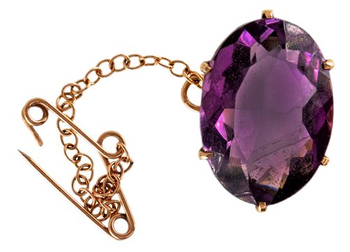 AMETHYST BROOCH, in gold (9ct; 2.79g; 17x11mm), by Wendts, features a claw set oval amethyst on a gold frame, pin-back with safety chain. Good very fine.