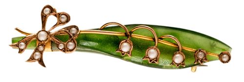 JADE FLORAL BROOCH, in gold (9ct; tot wt 4.02g; 46.5x14mm), by T&S (Taylor & Sharp), features a leaf made of jade and upon it is a floral display decorated with seed pearls, pin-back. Tip of leaf is broken off and needs polishing, otherwise very fine.