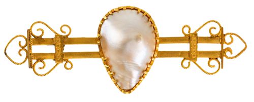 BLISTER PEARL BROOCH, c1910, in gold (tested as 15ct; tot wt 6.07g; 54x12.5mm), attributed to ...