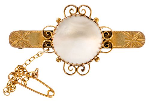 BLISTER PEARL BROOCH, in gold (9ct; 5.97g; 44x23mm), attributed to maker, Willis & Sons, features a decorated bar with a centrepiece of a circular blister pearl section in a multi claw setting surrounded with scroll work, pin-back with safety chain. Good very fine.