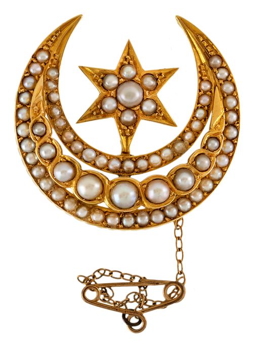 PEARL BROOCH, c1930, in gold (18ct; 9.53g; 30mm), by EWS (Edward William Saranealis), features a crescent with raised centrepiece with a star in the crescent, all decorated with pearls, pin-back with safety chain, with Hardy Bros Ltd case. Extremely fine.