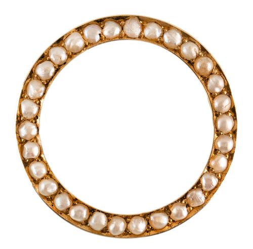 PEARL BROOCH, in gold (15ct; 2.10g; 23mm), by maker A.R.D, features a circle with thirty ...