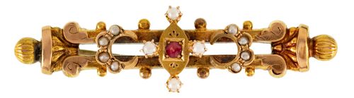 RUBY AND PEARL BROOCH, in gold (15ct; 3.61g; 54x14mm), attributed to maker, Aronson & Co, features two highly decorated bars with an oval centrepiece containing a small ruby and at each side and the top and bottom of this oval centrepiece are claw set seed pearls and on each side of the centrepiece are four seed pearls in a decorative setting, pin-back. Good very fine.