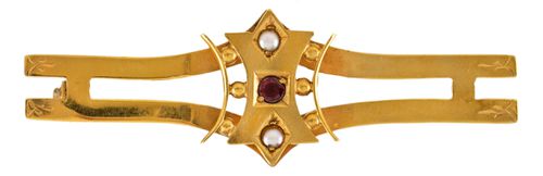 RED GEMSTONE AND PEARL BROOCH, in gold (9ct; 4.82g; 59x20mm), attributed to maker, Aronson & ...