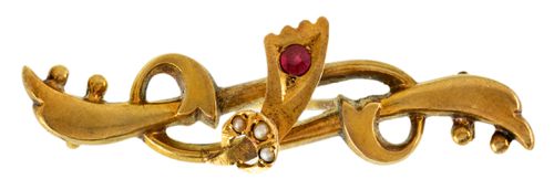 RUBY AND PEARL BROOCH, in gold (15ct; 2.47g; 45x14mm), by Aronson & Co, features a decorative wrap around bar set with a small ruby (chipped) and three small natural seed pearls, pin-back. Very fine.