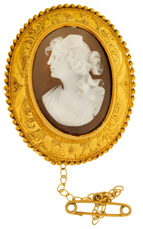 CAMEO BROOCH, c1870, in gold frame (18ct; tot wt 10.81g; 31x38mm), by H St (Henry Steiner), features an oval cameo of a lady's head and shoulders facing left and surrounded by an intricately engraved frame, pin-back (but pin missing) with safety chain, with an unnamed case. Apart from the missing pin, good extremely fine.