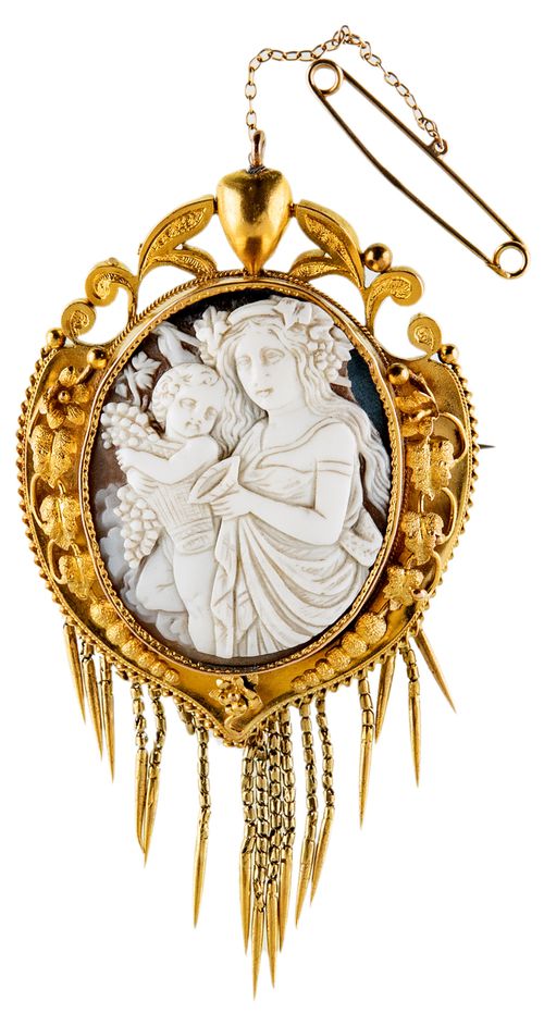 CAMEO BROOCH/PENDANT, c1875, in gold frame (tested as 15ct; tot wt 25.07g; 47x59mm + tassels), by L&W (Lamborn & Wagner), features a cameo of a lady holding a child and facing left with child holding a container of grapes, set in a decorative frame of leaves, tendrils and grapes and with a heart at the top with suspension loop and a series of tassels at the base, on the reverse is a b&w photograph of a man, no Perspex cover, pin-back with safety chain, in an unmarked case. A few tassels broken, otherwise good very fine.