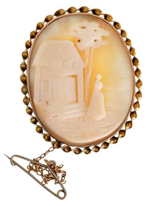 SHELL CAMEO BROOCH, in gold frame (9ct; tot wt 11.23g; 35x43mm), with crown and lion hallmark, by Sarre (R.R.), features a cameo of a lady outside a house with a tree beside the house, pin-back with safety chain. Extremely fine.