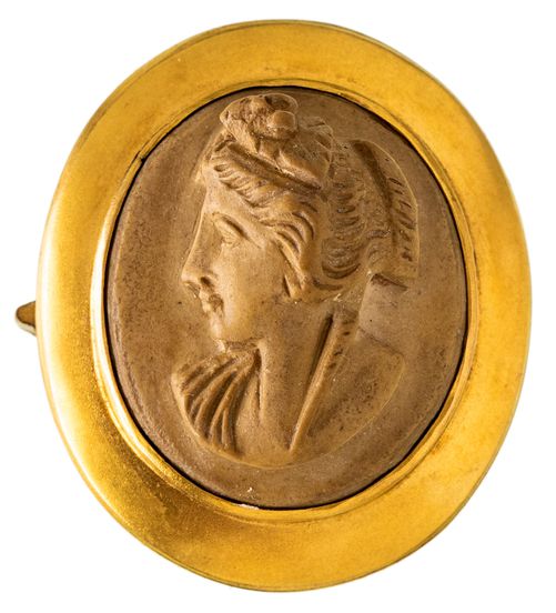 LAVA CAMEO BROOCH, in gold frame (9ct; tot wt 6.85g; 27x31mm), by A.B.Budgen, features a ...