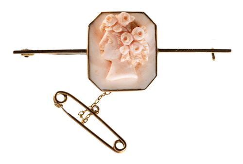 PINK CAMEO BROOCH, in gold frame (9ct; tot wt 6.68g; 27mm), by Flett & Son, ...