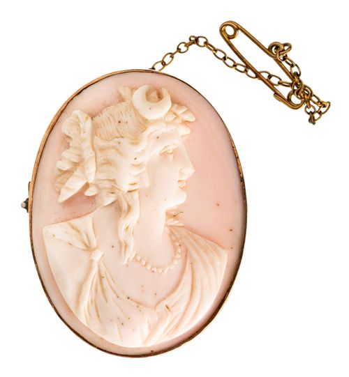 SHELL CAMEO BROOCH, in gold frame (9ct; tot wt 13.75g; 31x41mm), attributed to maker, Willis & Sons, a pink shell oval cameo of a lady facing right inset in a gold frame, pin-back with safety chain. Good very fine.