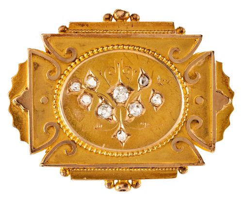 DIAMOND BROOCH, c1890, in gold (15ct; 12.69g; 39x31mm), by Denis Bros, features a patterned cross and in the centre is a plain oval engraved decorated section fitted with nine diamonds, pin-back with loop provision for safety chain, with Rutherford case. Hairlines, otherwise good very fine.