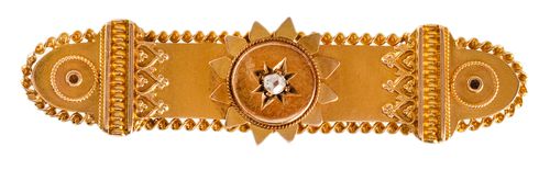 DIAMOND BROOCH, in gold (15ct; 4.99g; 45x11mm), maker unknown, features a highly decorated bar with a depiction of a flower in the middle and this with a small diamond in the centre, pin-back. Good very fine.