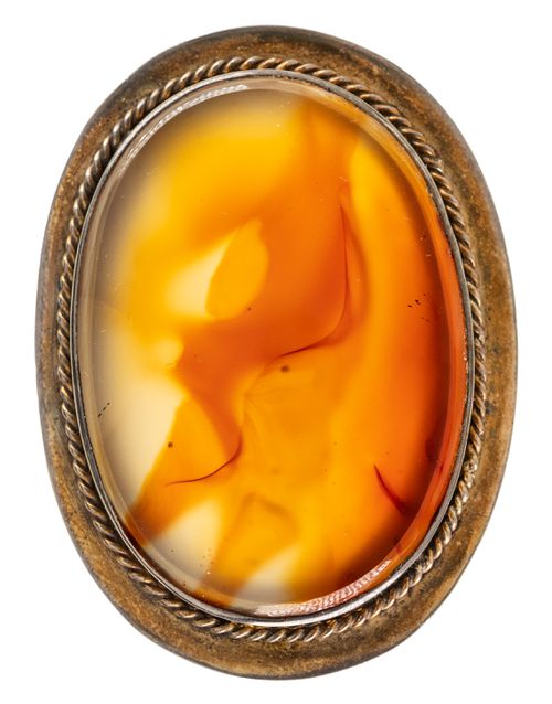 CORNELIAN BROOCH, in silver frame (tot wt 25.45g; 42x56mm), by O.C.Shrowder, features a large oval ...
