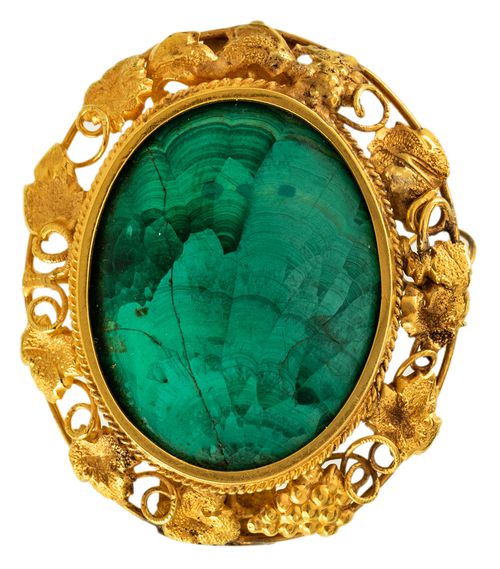 MALACHITE BROOCH, in voided gold frame (tested as 15ct; tot wt 11.18g; 32x37mm), no maker, features an early frame of voided leaves and fruit set around an oval piece of malachite, pin-back with loop provision for safety chain, with unofficial box. The malachite loose and with a crack, otherwise good very fine.