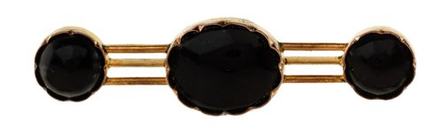 ONYX BROOCH, in gold (15ct; 5.80g; 46x11.5mm), by JMW (J.M.Wendt), features a thin triple bar with a central oval onyx and at each end is a circular onyx, pin-back with loop provision for safety chain. Good very fine.