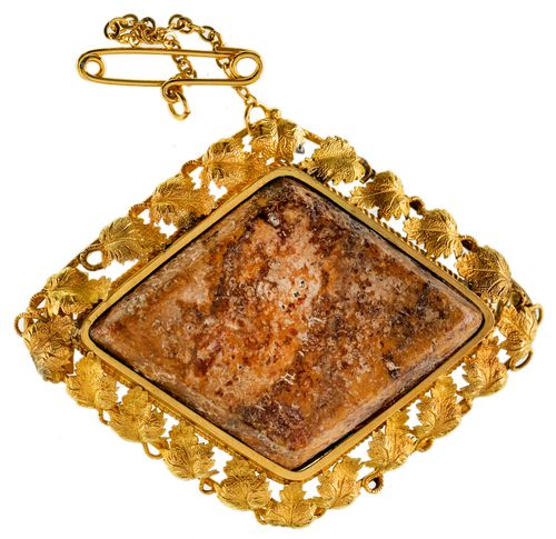POLISHED QUARTZ BROOCH, in gold (tested as 15ct; tot wt 11.10g; 34x38mm), maker unknown, features ...