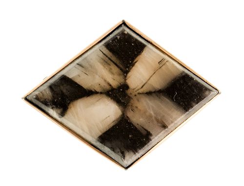 QUARTZ BROOCH, in gold setting (9ct; tot wt 4.87g; 29x22mm), by Suhard & Co, features a polished rhombus shaped piece of grey quartz with a black cross in the stone on the obverse and reverse, set in a gold frame, pin-back with loop provision for safety chain. Very fine.