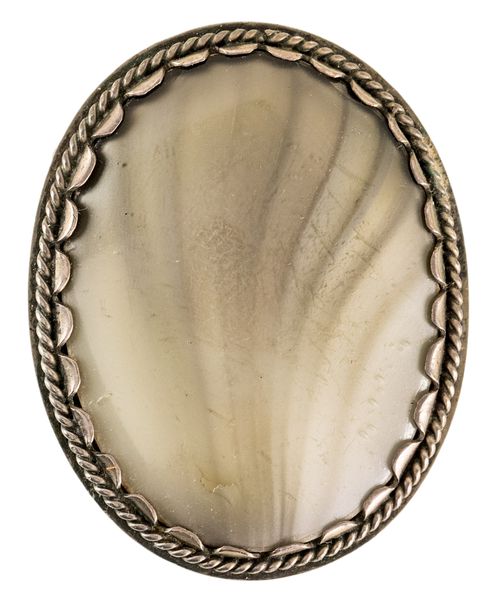 QUARTZ BROOCH, in silver frame (tot wt 15.79g; 37x47mm), by (I.E.) Hall, features oval gray quartz in a decorated frame, pin-back. Contact marks on quartz and a small chip, otherwise fine.