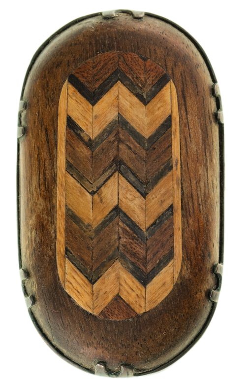 WOOD BROOCH, in sterling silver frame (tot wt 13.94g; 30x54mm), by O.Tucker, features an oval piece of timber with a centre decoration, pin-back with loop provision for safety chain; also a colour patch for 27 Infantry Battalion, AIF, in an unofficial box, on the underside of the box lid is written, "Ada Clive/Clasohm/Balhan/Sth Aus". Very fine. (2)