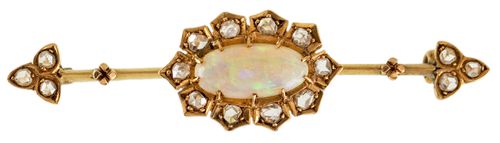 OPAL AND DIAMOND BROOCH, c1910, in gold (tested as 15ct; 5.84g; 51x12.5mm), by H.Newman, features a thin gold bar and in the centre is a claw set oval opal surrounded by claw set small rose cut diamonds and at each end of the bar are three claw set small rose cut diamonds, pin-back, with unofficial felt satchel and box. Extremely fine.
