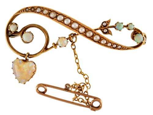 OPAL AND PEARL BROOCH, in gold (15ct; tot wt 8.08g; 46x25mm), by Denis (Bros), features natural seed pearls inset in a decorative scrolling setting and with small opals and also with a hanging heart shaped opal, pin-back with safety chain. Very fine.