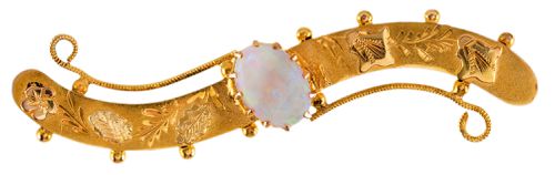 OPAL BROOCH, in gold (15ct; 2.09g; 40x10mm), attributed to maker, Aronson & Co, features a decorated curved bar with a claw set oval opal in the centre, pin-back. Extremely fine.