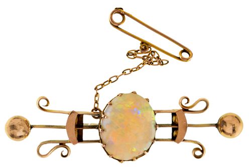 OPAL BROOCH, c1910, in gold (tested as 9ct; tot wt 7.15g; 57.5x17mm), attributed to maker, Donovan and Overland, features a decorative triple bar and in the centre is a claw set oval white opal, with safety chain, pin-back. Very fine.