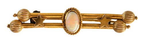 WHITE OPAL BROOCH, in gold (9ct; 3.60g; 48x10mm), by Newman; features a decorated double bar ...
