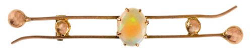 OPAL BROOCH, in gold (9ct; 1.94g; 48x8mm), attributed to maker, Willis & Sons, features a stylized double bar with a small oval claw set white opal in the centre, pin-back. Very fine.
